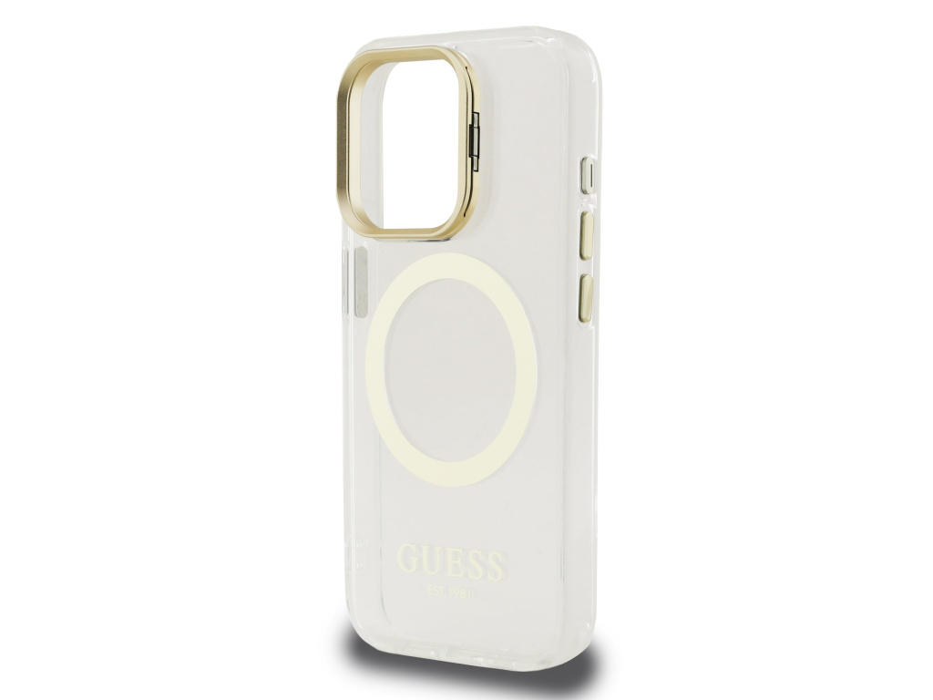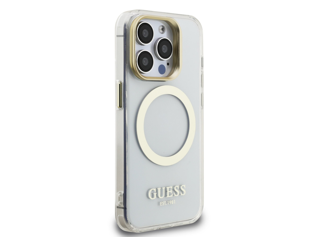 Guess IML Gold Outline Stand Camera Frame MagSafe Zadní Kryt pro iPhone 15 Pro Max