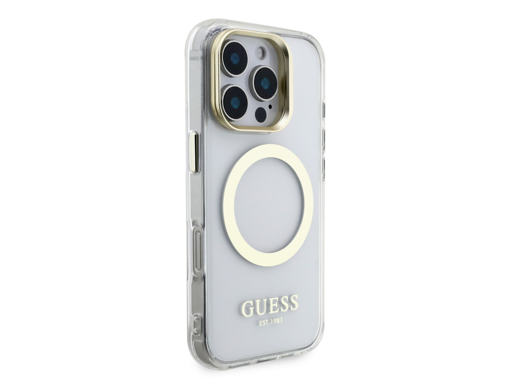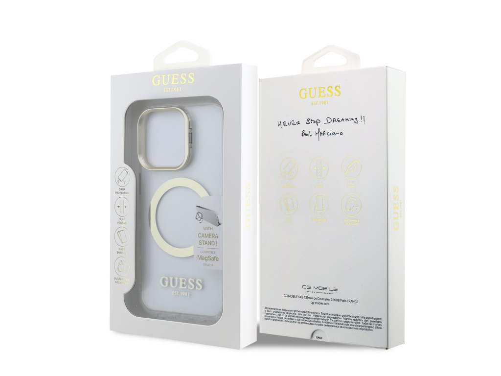 Guess IML Gold Outline Stand Camera Frame MagSafe Zadní Kryt pro iPhone 16 Pro Max