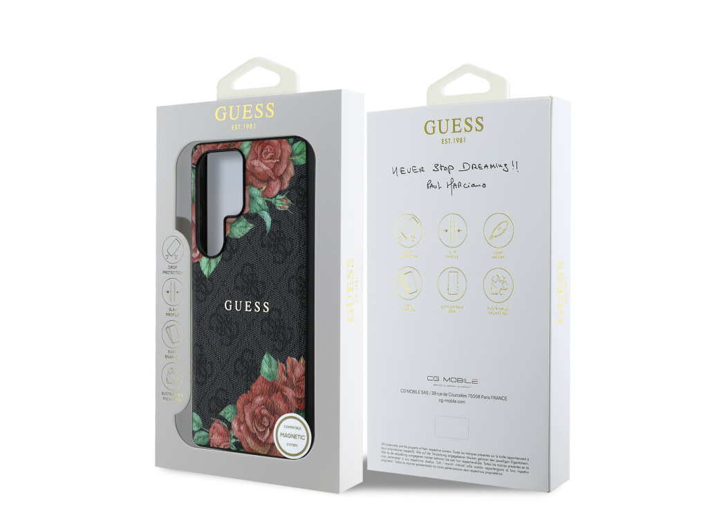 Guess PU Leather 4G Flowers Print Metal Classic Logo MagSafe je vyrobený z lehké a odolné PU umělé kůže a nabízí skvělou ochranu telefonu i pohodlí při používání.