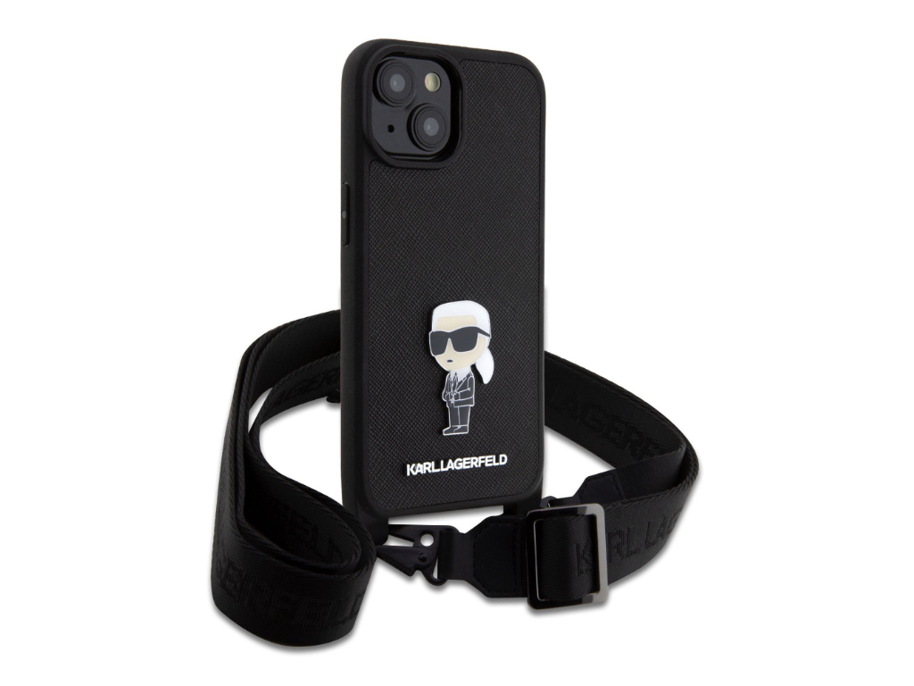 Karl Lagerfeld Saffiano Metal Ikonik kryt s crossbody popruhem pro iPhone 15 Plus černý