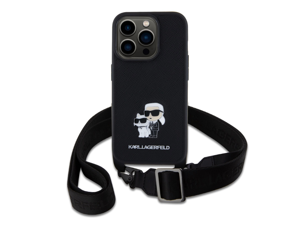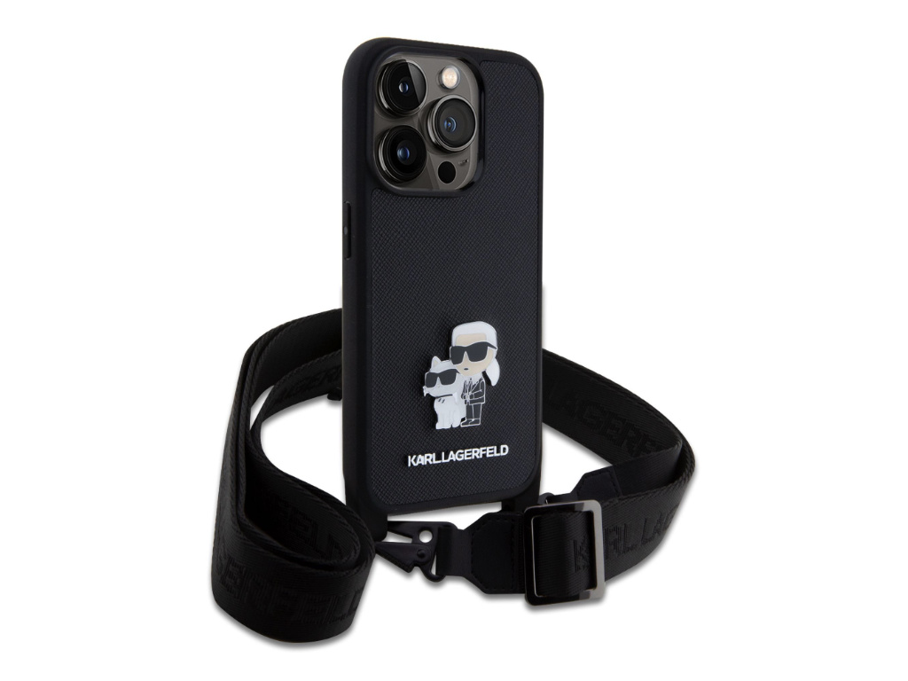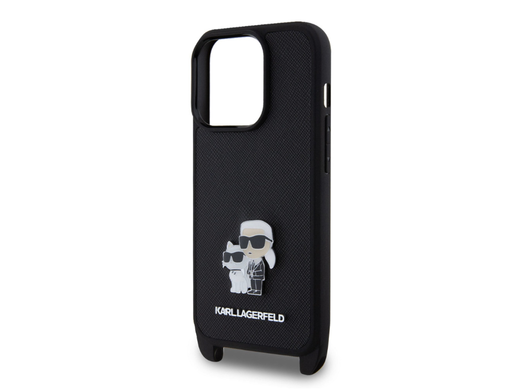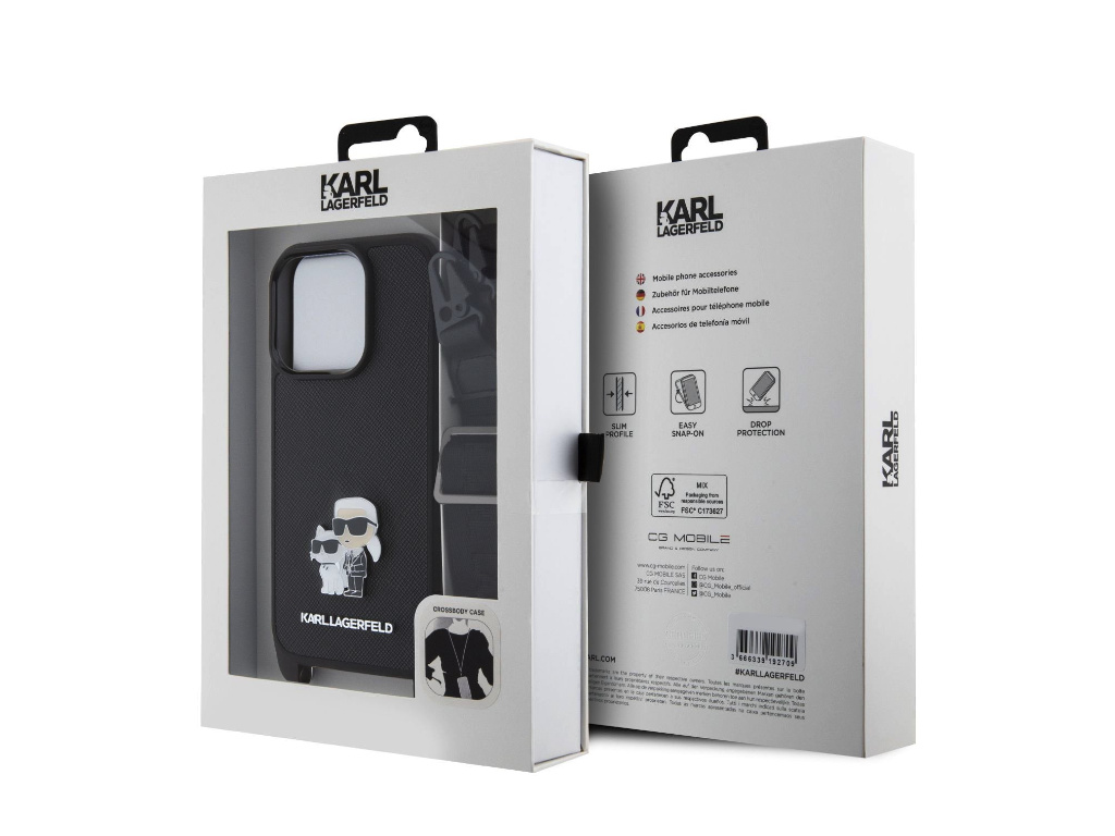 Karl Lagerfeld Saffiano Metal Karl and Choupette kryt s crossbody popruhem pro iPhone 15 Pro černý