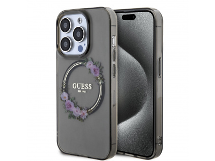 Prémiový ochranný kryt telefonu v kombinaci zadní strany s potažená látkou s motivem Guess, pružnými PU boky a vestavěným magnetem pro Apple MagSafe příslušenství.