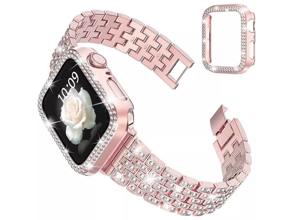 Sada Ochranný kryt s kamínky + ocelový článkový tah s kamínky řemínek Apple Watch 10 46mm